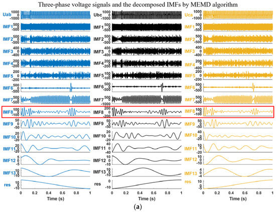 From Figure 4a, there are the same number of IMF components in each group of IMFs by MEMD, and Uab, Ubc, and Uca are all decomposed into 14 IMFs. Furthermore, the IMF in different voltages has the same frequency on the same timescale, such as the IMF8 (marked in red box), and the frequencies of Uab, Ubc, and Uca are essentially equal. Thus, MEMD solves the difficulty of matching and aligning the number and frequency of IMFs in Uab, Ubc, and Uca.
