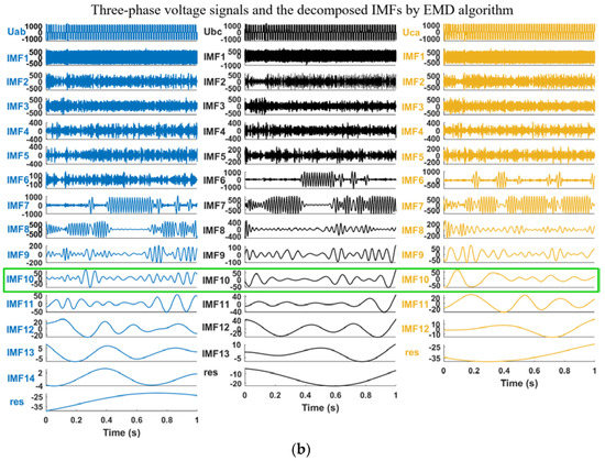 As shown in Figure 4b, the number of IMFs obtained from each signal decomposition is different; Uab is decomposed into 15 IMF components by EMD, while Ubc and Uca are decomposed into 14 IMFs and 13 IMFs, respectively. In addition, IMF frequencies of different signals in the same order are different; for example, for IMF10 (marked in the green box), the frequency of Uab is the largest, followed by the frequency of Ubc, and the frequency of Uca is the smallest. As a result, the IMF sets of the three-phase voltage signals Uab, Ubc, and Uca by EMD decomposition do not match in quantity and frequency. This is because the EMD decomposition process of Uab, Ubc, and Uca is independent for each signal without considering the internal correlation.