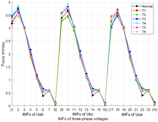 Figure 5 shows that there are significant differences between fuzzy entropy values under different converter fault states, especially IMF1 and IMF2 for Uab, IMF10 for Ubc, and IMF17 for Uca. Thus, fuzzy entropy can measure the complexity of the three-phase voltages. Therefore, it is reasonable to use fuzzy entropy as a feature vector to characterize and observe different fault modes of the converter.