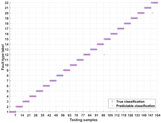 As shown in Figure 6, among 154 testing samples with 22 fault modes, only 2 samples are identified incorrectly, and the rest are all correctly output; thus, the diagnostic accuracy of the AFSA-SVM model is 98.7%. The results show that the proposed fault diagnosis method can diagnose the converter fault accurately and effectively. Therefore, this method has strong robustness to wind speed and noise in a wind power generation system.