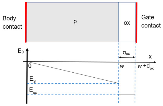 We assume the structure of an MOS capacitance as reported in Figure 1. In the structure, we consider the depletion region with the thickness w. An abrupt edge is assumed at the edge of the depletion region, at x = 0. At the same edge, it is assumed that the ohmic contact (body) is placed. The oxide region has a thickness of dox.