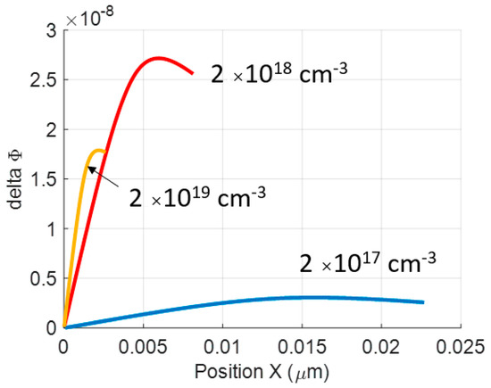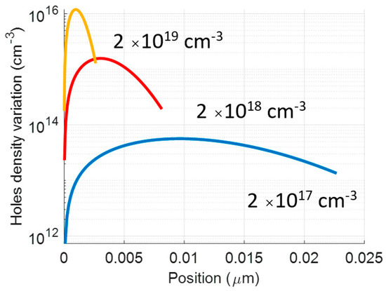 The first asymptote, Equation (18), describes the formation of a dipole. In the examined case with the p-doped substrate, the holes are pushed by the nonlinear interaction against the barrier, creating an accumulation within the depletion region. The function indicates that this accumulation has a maximum within the depletion layer, and is described by Figure 2, where the distribution of the hole variation is calculated for different doping concentrations. The increase of holes corresponds to a transport of the carriers from the substrate; thus, an equivalent negative charge must be considered at the edge of the region, at x = 0. This effect substantially describes the formation of a dipole.