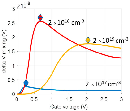Absolute value of self-mixing voltage generated within the structure, calculated at 1 THz, for different values of the substrate doping. The diamonds indicate the maximum. The potential distributions in Figure 5 are calculated respectively at the corresponding gate voltages.