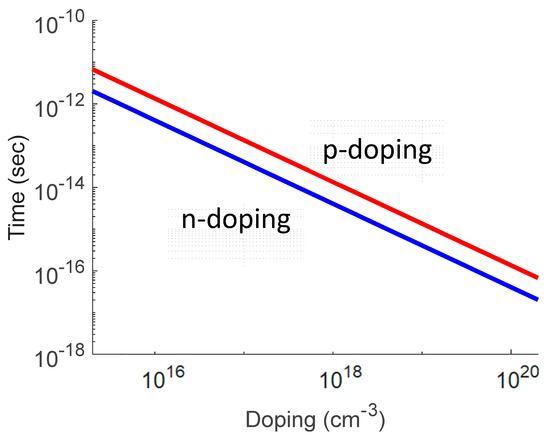 Figure 6 reports the dependence on the characteristic time constant, respectively, for the holes and electrons, as a function of the doping density, following Equation (22). Based on this equation, the response time could be extremely short. A limitation of the calculation should be considered if the assumption of the instantaneous generation of the forcing term, , cannot be accepted. The term indeed is borne as the average, along, at least, the half-life period of the incoming radiation. Thus, the RF period itself limits the response time.
