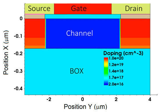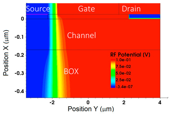 We observe that the self-mixing effect generates a current as the forcing term, Equation (10), and that the response of the semiconductor structure to this current is the formation of a charge dipole, distributed transversely to the barrier, along the depletion region crossed by the RF electric field. In order to overcome the simulation limit, in this last paragraph, we mimic the formation of the dipole, introducing within the structure a couple of parallel plate contacts, positioned in particular within the depletion region of the barrier involved in the self-mixing effect. As a test case, we performed simulations on a structure known as Junctionless FET (JL-FET) [14]. Figure 7 reports the doping distribution of the structure. Figure 8 reports the distribution of the RF potential inside the structure. We assume a 3.5 μm gate width, and a 500 nm gap between the polySi gate and source/drain n+ diffusions. The channel is n-type, doped 2.1016 cm−3, while doping n+ at the source, and the drain diffusions is 1.1020 cm−3. The SOI device layer is 170 nm and the gate oxide is 26 nm thick. We assume that an RF at 1 THz is applied between the gate and the grounded source.