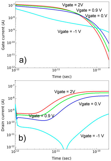 Simulations of the transient current in the JL-FET structure at four different values of the gate polarization, respectively, Vgate = 2 V, 0.9 V, 0 V, and −1 V: (a) current at the gate at the four biases; (b) current at the drain at the four biases.