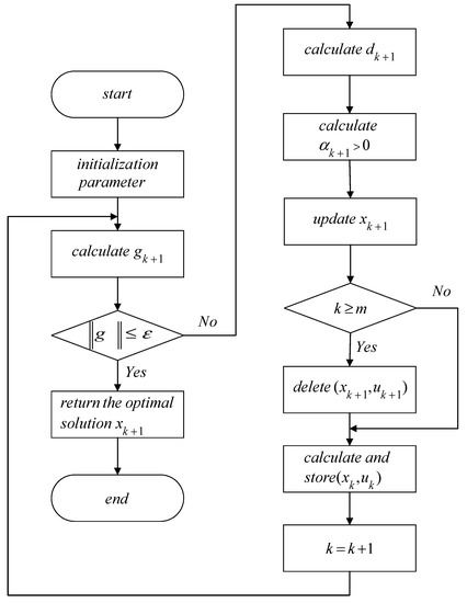 Step 3: Calculate gk+1. If the norm of gk+1 satisfies the operating error defined, namely , it indicates that the cut-off condition is met and the algorithm is terminated. The iteration point xk+1 is the optimal solution. If the cut-off conditions are not met, it is necessary to go to step 4 and continue to solve the optimal solution;