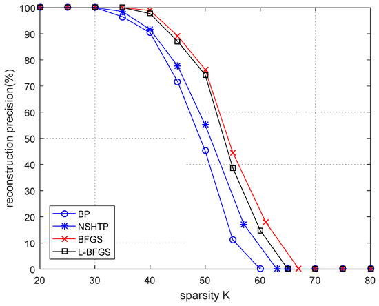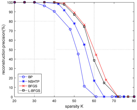 Figure 2, n = 256 and m = 128. As can be seen from the figure, there is little difference in reconstruction accuracy between the four algorithms. The reconstruction rate of the four algorithms is high. The BP algorithm has the worst reconstruction accuracy. The reconstruction accuracy of the BP algorithm starts to decrease when K = 35. The BP algorithm cannot reconstruct the signal when K = 62. The BFGS algorithm has the best reconstruction accuracy, and the difference between the proposed algorithm and the BFGS algorithm is very small. Both algorithms begin to reduce the reconstruction accuracy when K = 40 and cannot reconstruct the signal when K = 72. In general, the reconstruction accuracy of the BFGS algorithm is slightly higher than that of the proposed algorithm, but the reconstruction accuracy of the proposed algorithm is higher than that of the NSHTP algorithm and the BP algorithm.