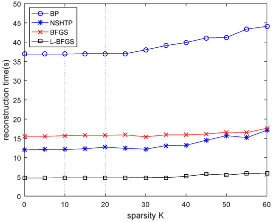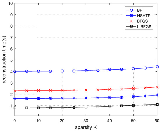 Figure 7, with the increase in sparsity, the BP algorithm has a mutation point when K = 30. When K = 35, the NSHTP algorithm has a mutation point, and the BFGS algorithm has a small mutation point. When K = 45, small mutation points appear in the proposed algorithm. It indicates that when n = 1024 and m = 512, sparsity has an impact on all algorithms. The BP algorithm and the NSHTP algorithm have a greater impact, and the proposed algorithm and the BFGS algorithm have a smaller impact. In general, the reconstruction rate of the proposed algorithm is the fastest and most stable, which is significantly better than the BFGS algorithm in the reconstruction rate.