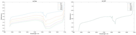 The morphological characteristics of the average spectral reflectance curves of soil samples with different water contents are different. In the spectra of dry soil samples (0% moisture content), the most significant absorption band is located around 1450 nm. As the moisture content increased, the soil’s spectral reflectance showed an apparent decreasing trend (Figure 3a). When moisture content is less than 20%, the noise due to moisture in the soil spectra is more pronounced. When the moisture content is ≥20%, the influence of moisture no longer increases evidently. In comparison, the rate of decrease in spectral reflectance tends to be gentle. In particular, the spectra in the range of 966–1450 nm tend to overlap. When the water in the soil pores is saturated, the entire spectral reflectance tends to be stable. With the increase in water content, the depth of the spectral reflection valley between 1400–1500 nm deepens. The difference between the spectral reflectance of wet soil samples with different water contents and the spectral reflectance of dry soil samples (Figure 3b) varies most significantly in the range of 1400–1500 nm, and this change is uneven.