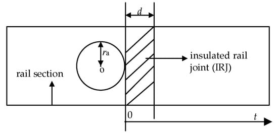 where , , is the apparent contact spot area, and is the actual contact spot area of wheel–rail. When calculating the wheel-IRJ contact resistance using Equation (25), the actual contact area of the wheel-IRJ can no longer be calculated according to because the presence of the insulated rail joint makes the actual contact area change. Assuming that the running condition of the wheel is unchanged when it passes through the insulated rail joint, the actual contact spot area of the wheel-IRJ is expressed by . is the vertical force on the wheel, and . is the mass acting on the rail for each wheel. is the rail hardness.