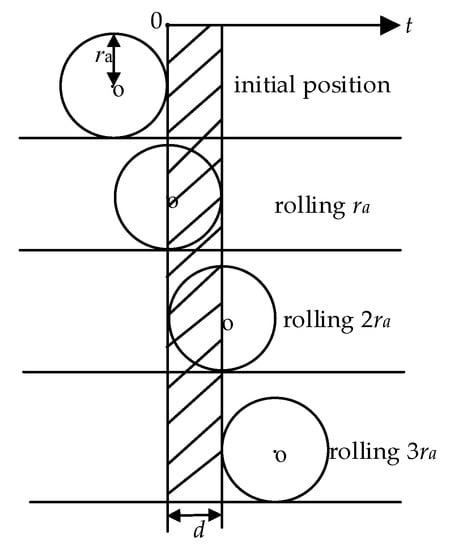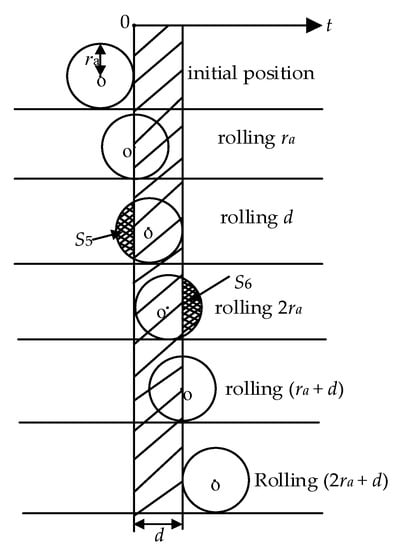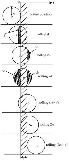 Figure 2 shows the relationship between the wheel–rail circular contact spot and the insulated endplate thickness. Under different relations between and d, the effective apparent contact area (x = 1, 2, …) of the wheel rolling from the initial position (the circular contact spot of the wheel–rail is just about to contact with the insulated endplate but not yet) to completely cross the insulated rail joint is as follows.