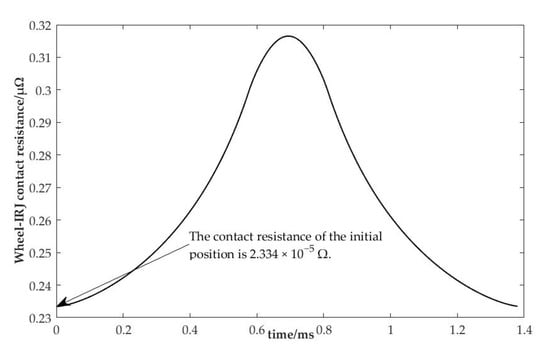 Hang Yang et al. [29] found that, when the voltage at both ends of the insulated rail joint is ≤20 V, no arc will occur by onsite collecting the current and voltage at the return cut-off point. Pengfei Su [17] found that, when the current flowing through the wheel–rail was 61 A, a voltage of 20 V was generated at the wheel–rail contact. Shiwu Yang et al. [2] simulated and tested the voltage at both ends of the insulated rail joint and the current in the circuit when different degrees of electric arc occurred in the laboratory. It can be concluded that, when the current is 61 A and the voltage is 20 V, no electric arc occurs when the wheel leaves the insulated rail joint. Pengfei Su [17] used Hertz theory and electrical contact theory to solve for a static wheel–rail contact resistance of 2.09 × 10−5 Ω under the condition that the voltage is 20 V and the current is 61 A. The wheel-IRJ contact resistance at the initial position calculated according to the model built in this paper is in the same order of magnitude as that in the literature [17], and the difference is 2.4 × 10−6, which is very small. The contact resistance is inversely proportional to the contact area. It can be seen from the contact area change relationship between the wheel and the insulated rail joint in Figure 3, Figure 4 and Figure 5 that the change trend of the wheel-IRJ contact resistance conforms to the actual situation.