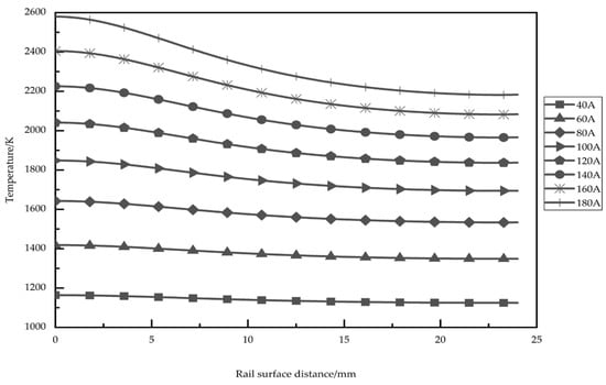 As shown in Figure 8, the electric arc heat increased with an increase in the current flowing through the wheel–rail contact surface. When the electric arc heat was less than the melting point of the rail (1500 °C), the contact resistance increased with an increase in temperature, as shown in Table 5. However, relevant scholars have found that the electric arc generated at insulated rail joints can instantaneously form a high temperature of 4000 °C–6500 °C [2]. Such a high temperature directly damages the rail and insulated rail joints by thermal erosion, which worsens the wheel–rail contact relationship, and even it affects traffic safety. Thermal erosion of insulated rail joints and rail by electric arc is one of the reasons for IRJ failure in high-speed rail stations.