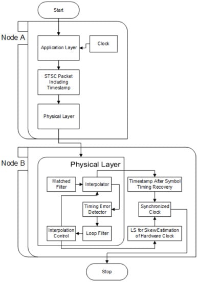 The whole process of STSC can also be explained with the help of flowchart shown in Figure 2. At the application layer of node A, a software clock is used to generate a timestamp. That timestamp representing the time of node A is packed into an STSC packet, which is eventually sent over the medium with the help of the physical layer. The physical layer deals with all the transmission details such as the modulation scheme, data rate, etc. This packet is transmitted to node B. At node B, the physical layer tries to recover the transmitted symbols which were affected during transmission. To recover the symbols, symbol timing recovery is conducted using multiple components. After passing the data from the matched filter, a timing error detector tries to extract the timing offset whereas a loop filter tries to track the error in real time [26,27]. On the computations of the loop filter, the interpolation control determines how to correct the upcoming symbols and instructs the interpolator accordingly. The output of the interpolation control specifically can adjust the time offset and is known as the fractional interval . Applying the least squares (LS) method to the output of the interpolation control leads to the skew estimation. This skew is used to correct and synchronize the time skew of node B’s clock. The output of the interpolator, which consists of the received symbols, contains the clock value of node A and hence can be used to correct the time phase error of node B’s clock. Once the time phase and skew are corrected, the clock is synchronized with the clock of node A.