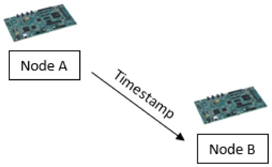 The STSC approach is illustrated in Figure 1. In this approach, when a V2X node (e.g., a vehicle) wants to synchronize in time with another node such as a vehicle, pedestrian or infrastructure within a V2X wireless system, it sends one timestamp which includes the node’s current time.