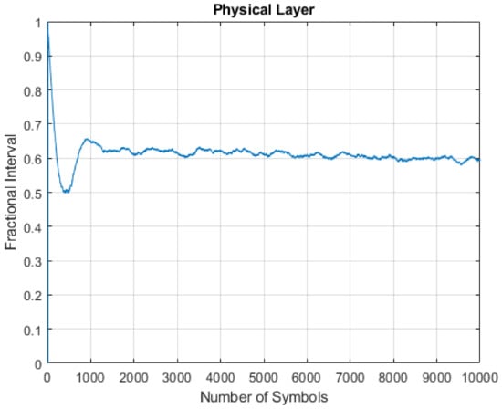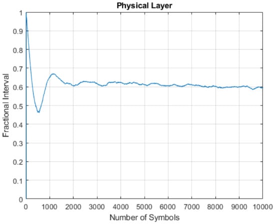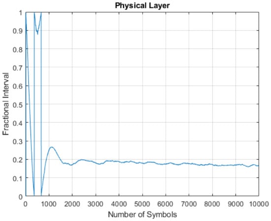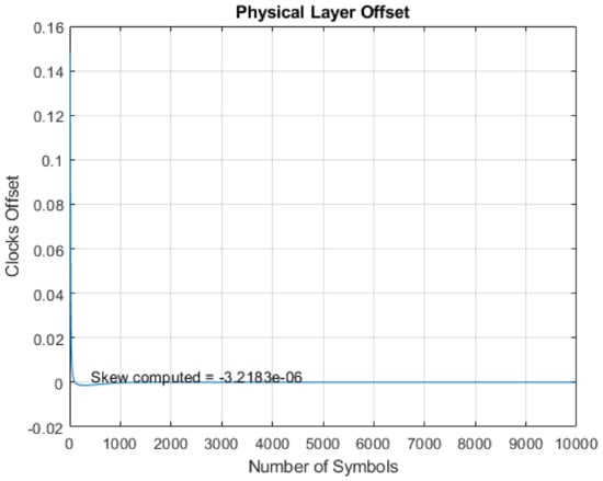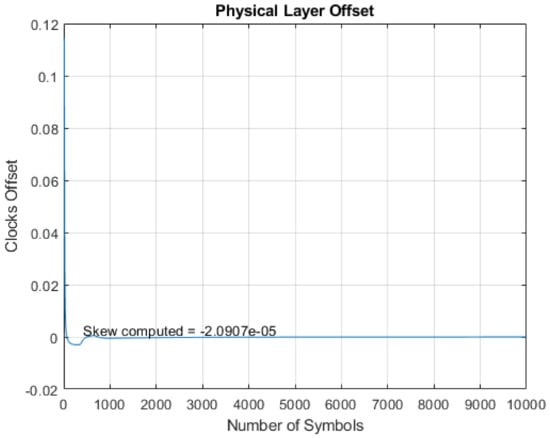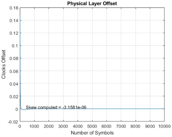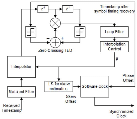 When two nodes try to synchronize at the physical layer, the received packet must undergo a symbol timing recovery [33,34]. One such system using PLL was used here. The symbols received in timestamp packets were binary PAM symbols. These symbols passed through the interpolator, timing error detector, loop filter, and interpolation control. A zero-crossing timing error detector (ZC-TED) was used to detect the timing error with the help of symbol values crossing at the zero level [35]. The loop filter tried to track the timing error detected by the ZC-TED. The interpolation control instructed the interpolator to change the sampling instant so that the next sample could be received with less error. Every next symbol error was detected, tracked, and the sampling instant kept changing until it completely tracked the error. These components were implemented for the computation of the fractional offset present between the sender and receiver clocks [33]. The output of the interpolation control was the fractional interval , which is a very important signal for extracting the time skew.