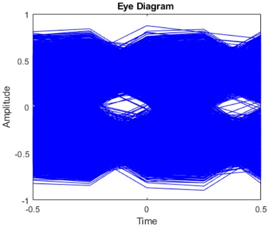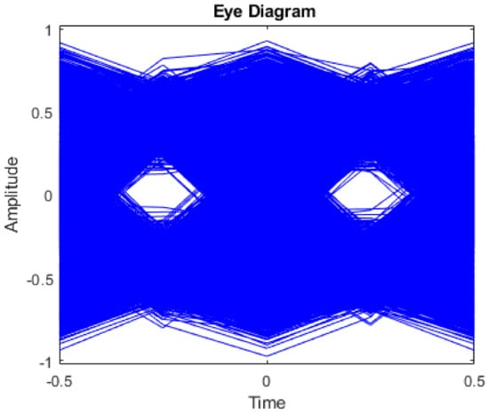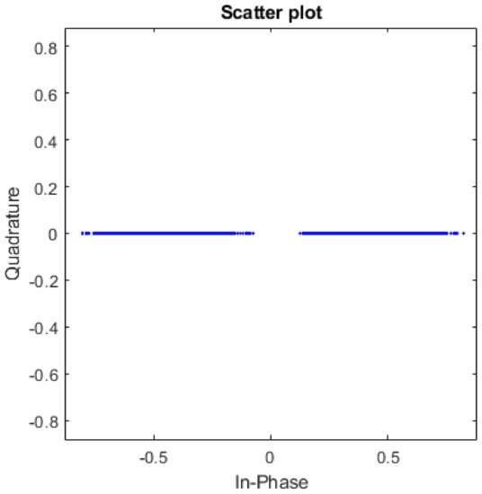 The output of the matched filter is shown in the eye diagram in Figure 5. The received symbols had a timing error. When that error was tracked using the symbol timing recovery method, the output of the interpolator was synchronized in time and the corresponding eye diagram is shown in Figure 6. This eye diagram shows that the PAM symbols were simply recovered. The scatter plot before (Figure 7) and after the timing recovery (Figure 8) also shows that without time synchronization, no pair of wireless nodes could communicate with each other.