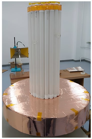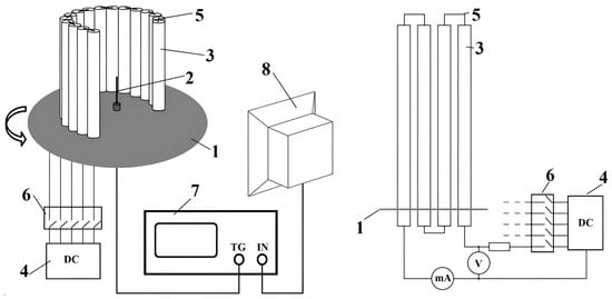 The antenna system under study (Figure 1 and Figure 2) consists of a round conductive base (1) with a diameter of 500 mm, where a small antenna (2) with a length of 30 mm is installed in the center. The use of a short antenna, which is not necessarily effective, is explained by the fact that its characteristics do not depend much on frequency, which means it will not greatly affect the frequency response of the entire system. Around this antenna, there are 16 standard T8 fluorescent lamps, with each having a length of 550 mm and a diameter of 28 mm (3). The distance from the linear antenna to the axis of the fluorescent lamps is 95 mm. These lamps are connected, in four separate groups (four lamps in each of the groups), to the power supply. Each group of lamps could be independently switched on using jumpers (5) and a switchboard (6). This switching method was chosen to ensure the same and stable value of the discharge current in the lamps when connected to a single power source. In addition, with this method of switching on the lamps, the supply wires do not affect the radiation pattern of the antenna system. There were four discharge current values selected in the range of 35 to 200 mA (35, 50, 100, and 200 mA). Figure 1 on the right shows the detail of the connection diagram of one of the lamp groups.