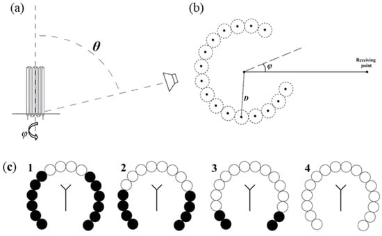 Figure 3 shows the geometry of the mutual arrangement of the antenna system and the schematic diagram of experimental measurements, as well as four combinations of switching on lamps. The receiving antenna was located at the polar angle θ of 80 degrees, which did not change, since the dependence of the field of the antenna system changed slightly based on the parameters of the system.
