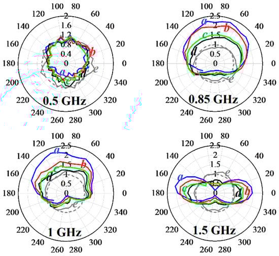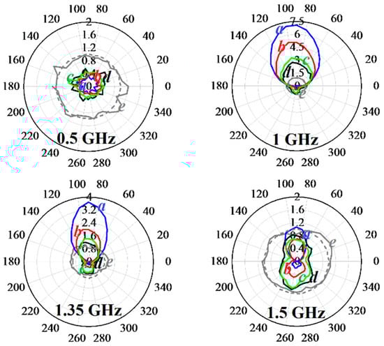 Radiation patterns for the first lamp configuration at different frequencies and discharge current values: a (blue curves) 200 mA; b (red curves)—100 mA; c (green curves)—50 mA; d (black curves)—35 mA; e (gray solid curves)—free linear antenna (no discharge).