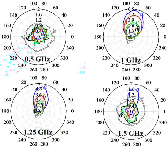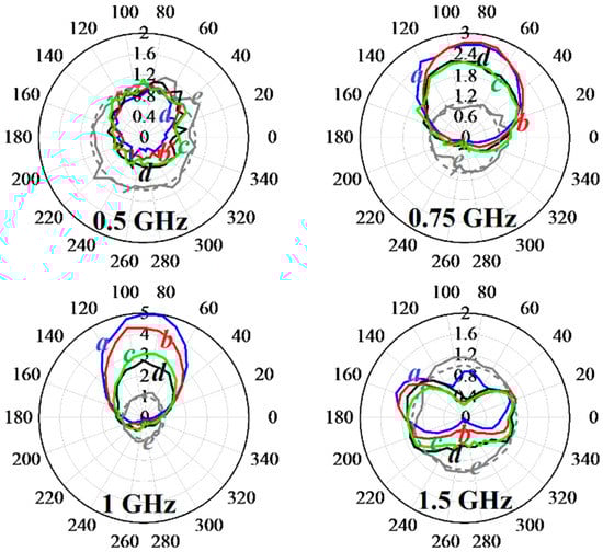Figure 7 and Table 4 shows the radiation patterns for the fourth lamp configuration. As in the previous three cases, the maximum intensity occurred at a frequency of 1 GHz, at which the power flux was more than seven times that of the free linear antenna. However, as the frequency increased to 1.5 GHz, the power flux rapidly decreased, and the radiation pattern became less directional.