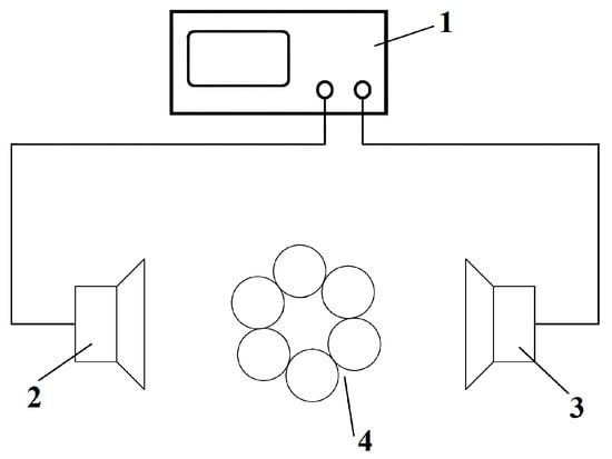 The microwave measurement system: 1—network analyzer; 2, 3—horn antennas; 4—six identical lamps of the standard size T8 connected in series.