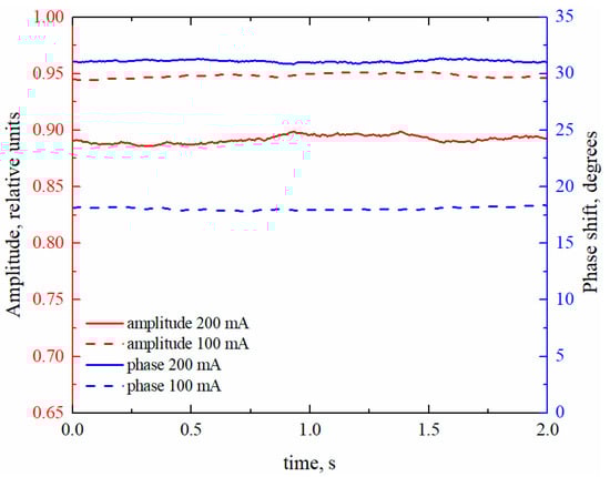 Figure 9 shows the time dependencies of the amplitude and phase of the 20 GHz signal for 100 and 200 mA discharge current values. Such a temporary representation is good because it shows the random variation of the parameters of the gas-discharge plasma in fluorescent lamps.
