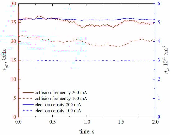 By using Formulas (6)–(9), it is possible to determine the corresponding dependences of the electron collision frequency and electron density (Figure 10) for 100 and 200 mA discharge current values.