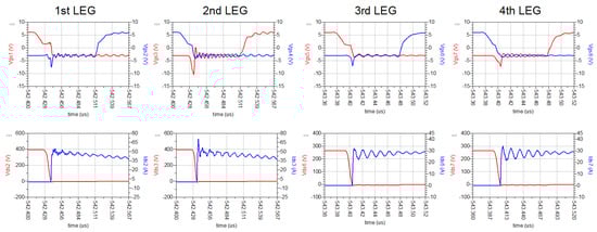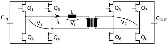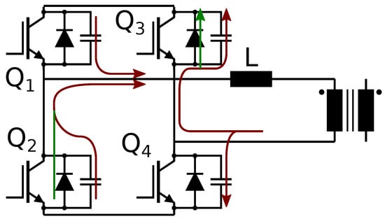 The DAB converter allows us to obtain ZVS owing to the inductance L that acts as a current generator, charging and discharging the devices’ output capacitances during dead time. Figure 3 shows what happens during dead time when Q1–Q4 are set OFF and Q2–Q3 are set ON for the FB at the primary side. The inductor forces a current that discharges of Q2 and Q3 while charging Q1 and Q4. When the energy of output capacitances is over, the devices proceed in reverse conduction, acting as free-wheeling diodes, enabling the activation of Q2 and Q3 with an almost null drain-source voltage. This practically eliminates the switching losses at turn ON. ZVS operation is assured when Equations (4) and (5) are both positive [15] and when the power balance
