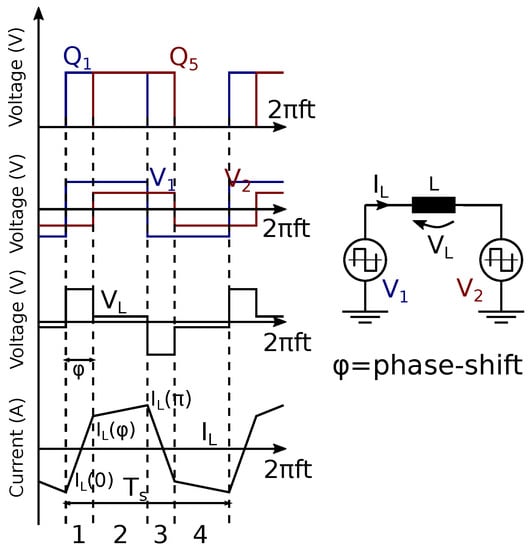 A schematic of a DAB converter is shown in Figure 1: two full bridges (FBs) are connected at the primary and secondary side to a high-frequency transformer with a series input inductor that provides energy storage. The two FBs typically operate at a fixed switching frequency and duty cycle, and the power flow is controlled by regulating the voltage applied to the series inductor by adjusting the time displacement (phase shift) among the gate signals of the two FBs. The symmetrical structure enables bidirectionality, whereas the wide voltage range generation (either in buck or boost mode) is guaranteed by the possibility of alternatively imposing the sum and difference of the input/output voltages across the inductor. The fundamental law of a DAB converter is retrievable analyzing the waveforms in Figure 2. For the sake of clarity, steady-state operations, constant input and output voltages, the absence of a transformer, and single phase-shift (SPS) modulation are assumed. SPS means that the devices within the same FB are ON for half a period at fixed diagonals (for instance, Q1–Q4 share the same gate signal as well as Q2–Q3), while the useful phase-shift lies on the gate signals of devices with different FBs.