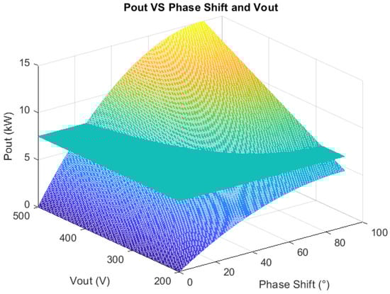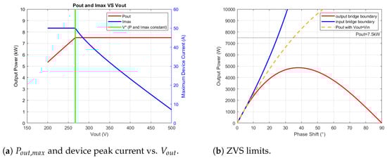 In this configuration, Figure 5b shows the ZVS limits for the input and output FBs, where ZVS operation is guaranteed in the region within the two boundaries, that is, when for the output full-bridge and for the input full-bridge, plus a contribution obtained from Equation (9). The latter has a negligible effect on the boundaries above , due to the low value of ; therefore, the nominal condition always provides soft switching beyond this threshold. For , the ZVS condition is above a phase shift of ; because this value is lower than the phase-shift value for (Table 4), soft switching is always verified in the actual design for nominal power. Moreover, for , ( phase-shift value), the ZVS condition is possible because the output power is . In Figure 6, the output power is related to the phase shift and output voltage with a threshold plane at .
