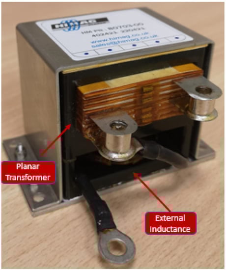 The total selected input series inductance L = 8.35 H was obtained as the sum of the transformer leakage inductance and external power inductor in series to the primary. The realized component is depicted in Figure 7: the external inductor was realized in the same enclosure of the transformer, practically doubling the transformer volume. The transformer characteristics are shown in Table 5. The specified RMS current was obtained from the simulations. A transformer with a leakage inductance equal to the target value of H would have minimized the dimensions and maximized efficiency (the estimated inductor power loss is against the of the transformer for full power operations) but was not possible because, to obtain such leakage inductance, the deterioration of the magnetizing inductance would have been too large. Nonetheless, the transformer + inductor component was still very compact (94 mm × 53 mm × 65 mm), and its predicted efficiency at full power was very high (.