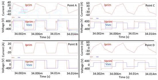 Primary current and primary/secondary voltages for the four operating points specified in Figure 8.