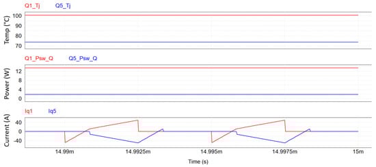 Junction temperatures, switching power losses, and drain current of Q1 and Q5, with a ambient temperature at point D Pout = 5.33 kW.