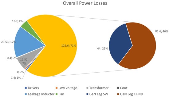 Finally, Figure 11 shows how the losses are distributed on the overall system for point B. For these computations, the losses of device drivers and low voltage controlling and sensing circuitry that are described in the next section were considered in terms of budget. It is evident that transistor losses account for more than of total losses, where is due to conduction losses, while the leakage inductor overcomes the transformer losses. If the inductance value can be directly embedded into the planar transformer, the efficiency gain would be significant. This graph also points out that the selection of a switching frequency is a good compromise between compactness and performance for this voltage and current levels: at lower current/voltage levels, this GaN technology can switch up to , but for the I/V levels of this circuit, the switching losses at such high frequency would significantly decrease the efficiency. Moreover, the core losses in the transformer would significantly increase at higher frequencies.