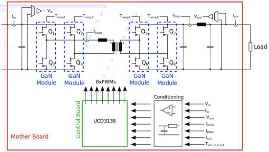 The converter was built following a modular approach and with a sparse component distribution in the main board in order to increase the prototype testability and eventual tweaking. This choice for the first development of the prototype obviously decreased the overall power density, which can be considerably increased in a successive design iteration. The three modules constituting the system were the mother board, control board, and GaN daughter module. The schematic of the entire converter is shown in Figure 13. The mother board was a FR4 PCB with thickness with 4 layers of 2 oz of copper to withstand the high current levels of the power section. In addition, a wide exposed copper area, either on top and bottom layers connected by thermal vias, was arranged for the better thermal conductivity of the transformer. The low voltage section was populated by sensors and conditioning circuits of analog signals and by PWM signal traces. Power and low-voltage sections reference grounds were kept separated by a commercial isolated DC/DC AE40-EW-S12 by CUI that acted as an auxiliary supply providing a maximum of and . This auxiliary supply was largely over-sized for this application and was mainly selected for its availability: the dimensions of this functional block can be widely reduced with a custom design. In the layout design, and for clearance and creepage distance, respectively, were applied in conformity with the IEC 61010-1 and IEC 60335-2-29 standards. The control board was a 4-layer FR4 board specifically designed to implement the control law of the converter. The board received sensed signals from the mother board and output PWM signals. The main component was a UCD3138 [20] controller by Texas Instruments. The controller is a dedicated solution for power supplies characterized by a digital environment that manages a fast hardware state machine. This yielded less general-purpose microcontrollers than the typical C2000 family, with the advantage of being less energy-consuming. In this way, multiple feedback loops could be handled, sectioning fast paths for higher bandwidth response. An important feature is the possibility to generate 4 PWM signal couples at a higher time resolution () interlocked by an embedded phase-shift mechanism. The GaN daughter module consisted of two separated boards, a driver board and an IMS board. This solution was implemented to satisfy the need for enhanced thermal management together with minimal parasitics [21]. These boards are described in Figure 14 and Figure 15.