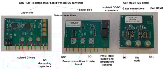 The IMS board was a PCB, where two GS66516B transistors were placed to form a half bridge, while the insulated metal substrate was in charge of conveying the heat produced to the heat sink, minimizing the thermal resistance. The driver board was implemented in a 4-layer FR4 PCB and was populated by isolated gate drivers, isolated DC–DC converters for power supply, and ceramic capacitors for the local DC decoupling of the DC link for the minimization of the power-loop stray inductance. Two isolated single-channel ADUM4121 [22] gate drivers by Analog Devices boosted the digital PWM signals from the microcontroller in two +6/−3 V gate signals with fast transitions and high peak/sink current capabilities, fundamental characteristics when driving WBG devices. Given a maximum skew of the delay time among two different ADUM4121 of and the very fast commutation of the switches (delay time + rise/fall time <), a nominal dead-time value was selected and implemented in the PWM command generation. The placement of the drivers in the board was optimized to reduce the distance between their output and the gate ports of the transistors as much as possible to minimize the inductance of the gate driving loop. To this aim, a short connector toward the IMS board was used, and the connection was made with the transistor Kelvin-source.