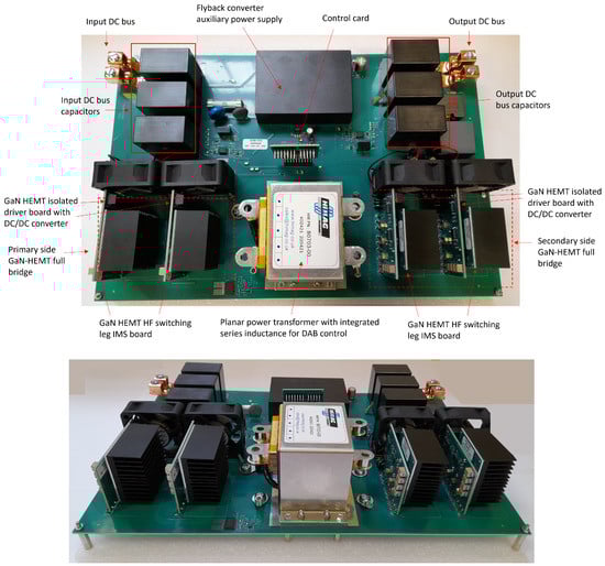 A DC–DC DAB converter was designed and implemented, exploiting GaN technology and planar transformer technology at switching frequency. The converter operates in full power mode from a nominal input voltage of to a variable output voltage in the range of 267–500 V. For the 400–500 V output voltage range, the efficiency is above . This efficiency is in line with that of the state-of-the-art DAB converters in GaN technology used for charging applications in [9,10,11], whereas the output power is twice that of the others. The proposed prototype converter is air cooled, and its overall layout has not been optimized for space, but the dimensions of the power bridge modules, magnetics, and DC capacitors show the potential of the selected technologies for very high volumetric power density. This makes this technological solution very attractive for automotive battery charging applications.
