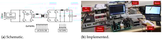 In Figure 16, the converter prototype (230 × 348 × 107 mm) is displayed, highlighting the main hardware sections. As discussed before, the prototype design was not optimized for space saving but for ease of testing and tweaking. In the picture, a large part of the space is occupied by the bulky auxiliary power supply (largely over-sized), the fans (largely over-sized), and the heat sink of the GaN IMS board. All these components could be much smaller in a final implementation of the converter for on-board battery charging applications; in this case, the cooling could probably be liquid, and a more optimized 3D layout could be produced. The compactness of the key components, i.e., the GaN daughter boards, the magnetics, and the DC-link capacitors, is the important aspect in this regard. The functionality of the prototype was tested through the setup schematized in Figure 17a and implemented as shown in Figure 17b. This set up was power-limited, so the converter could not be tested at full power. Further testing will be performed in a future phase. The input voltage was provided by two DC supplies in series connection: an AIM-TTI CPX400D and a Delta Elektronika SM 70-22. The maximum input power available was due to the limitation of the input current () of the CPX400D. The scope was a MSO-56 Tektronix, the load consisted of power resistors in series-parallel connection, while the master controller was a laptop directly connected to the control board via a PMBus interface forcing a fixed phase-shift value to perform tests in open-loop conditions. Regarding the acquisition of primary current, primary voltage, and secondary voltage, two differential active voltage probes (Aaronia DP1—DC to , and DP25 CHAUVIN ARNOUX—DC to ) and a wide-band DC/AC current probe (Keysight N2783A, , DC to 100 MHz) were used.