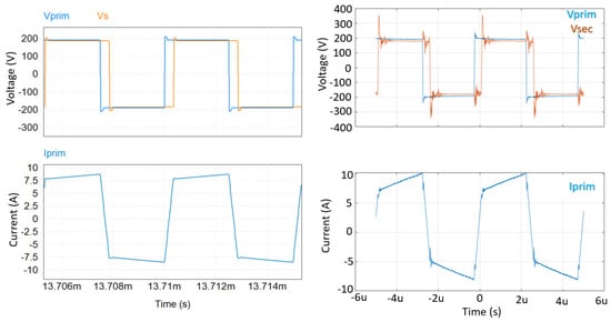 Comparison between simulation (left) and measured (right) values of primary/secondary voltages and primary current in the and condition.