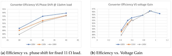 Additional measured data are shown in Figure 19, where the trend in converter efficiency is assessed with varying phase-shift control. Performance improvements seem be linked to higher phase-shift values in Figure 19a; however, this is true only because under the tested conditions, higher phase shift coincided with a voltage gain () closer to unity. As described in Figure 5b, unity voltage gain is the best working condition for the DAB.