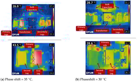 Finally, it is also interesting to show some pictures provided by the infrared thermal camera that we used during the first prototype assembly and characterization to identify eventual hot spots that may indicate assembly issues or design shortcomings. Figure 20 corresponds to a converter operating in the condition, providing insight into the temperature incrases of different parts of the circuit for two different phase-shift control values. The transformer (comprehensive of external inductance) and bulk capacitors remained at ambient temperature, while the GaN modules (mainly their heat sinks are visible) showed a modest temperature variation. Looking at the magnification of the primary side FB in the lower part of the figure, it is possible to appreciate some additional thermal stress in the first leg compared with the second one. From this slight asymmetry in the temperature, it was possible to identify an issue in the layout of the ground loop of this leg in the mother board, which induced a higher stray inductance. This will be fixed in a future iteration of the board to further increase the performance.