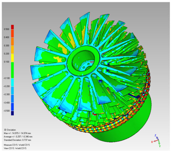 Following the rotor CAD model construction, the model accuracy was verified. Reverse engineering software Geomagic Qualify was employed to compare the errors of the scanned data of the rotor CAD and blades to identify any abnormalities or inconsistencies in the CAD and sample positions, dimensions, and geometries. The set nominal range ±0.1 mm and critical value ±0.5 mm are based on the manufacturer’s requirements and cannot be lower than the scanner’s specifications. These settings were compared to ensure that all turbine blades satisfied the precision requirements. If the comparison results are inconsistent, the CAD model shall be corrected. The comparison results are presented in Figure 6. It can be found that the deviation values are almost all within ±0.1 mm. In fact, the point data at the edge of the scanned object will be scattered, so it is reasonable to expect a higher deviation value at the tip of the blade.