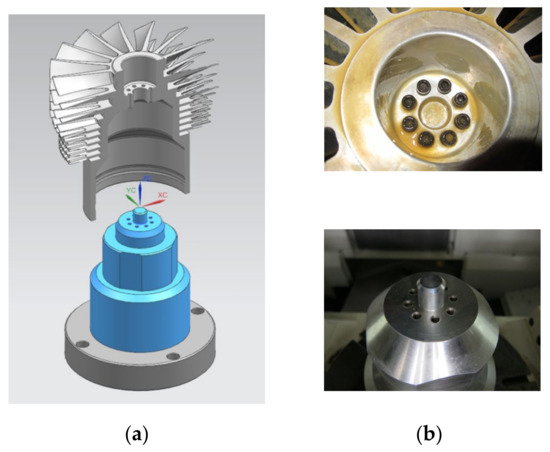 The jig is essential in the machining process and clamps or fixes the workpieces on the machining platform to limit the freedom of movement of the raw materials. If workpieces cannot be secured during machining, errors, position deviation, and dimension errors can occur. The jig must be designed to securely fix the position of the workpiece and minimize the effect on the operation range of machining. The fixture jig used in this study is currently designed in reference to the geometry of the inner bore surface of the rotors. The engineering tolerance of the clearance of 0.03 mm was obtained to ensure clearance fit of the rotor and jig fixture. An adapter board was used to fix the rotor on the jig of the mill machine, as depicted in Figure 7. The Ø24 mm through hole on the hub of the rotor is used for fine positioning during assembly with the jig. The surrounding eight holes can be used to fasten the rotor to the jig with eight M6 screws.