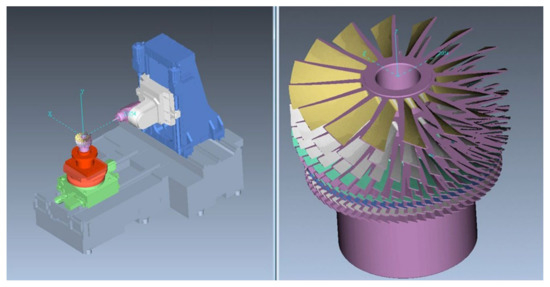 To further demonstrate the pneumatics of impellers and blisks with an increasing number of blades and increasingly complicated curved blade surface geometry errors, the present study employed three-dimensional (3D) scanners and incorporated reverse engineering and five-axis machining techniques to design new models for industrial development. Zhao et al. [16] conducted reverse modeling and five-axis machining experiments on aircraft engine impellers, revealing that the machined sample and research model had an error lower than 0.06 mm. In addition, She and Chang [17] used 3D measurement devices to obtain geometric point data, which they then used to generate turbo blade CAD models in the CAD and computer-aided machining (CAM) system of Unigraphics (UG). Discarding the CAM module of the UG software, they applied the UG Graphics Interactive Programming language to generate the cutter machining paths, the efficacy of which was then verified using the cutting simulation software VERICUT [18,19].