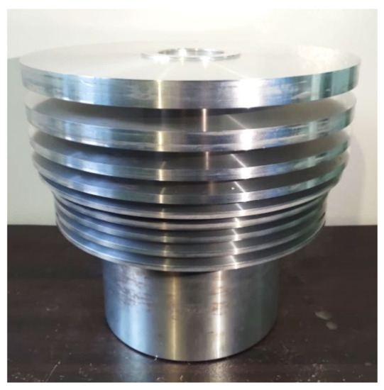 The five-axis horizontal machining center Tongtai HB-630SE(Tongtai, Kaohsiung, Taiwan) was used to cut the turbomolecular pump rotor. The blank was aluminum alloy AL6061-T6(Sheng Kwang Aluminium Co. Ltd., Kaohsiung, Taiwan) with a height of 269 mm and a maximum diameter of 300 mm. A CNC lathe was first used to cut the nine stages of the blade blanks, as depicted in Figure 9. Table 2 lists the blade number of each stage and the machining time. The total machining time was 18 days and 23 h. The machining process and final product are illustrated in Figure 10. The average current measured during processing was about 15A, and the total processing power consumption was about 4500 KWH.