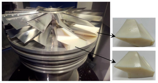 The first four stages’ blades near the tip exhibited poor surface quality resulting from the machining vibration induced by the clamp length of the finishing cutting tools and blade design, as shown in Figure 11a. The surface roughness is 4.4 μm. Even changing the processing parameters, such as the cutting depth, feed rate, and spindle speed, failed to improve the quality. In order to limit the freedom of the opposing blades and suppress chatter during machining, several block jigs were designed, as shown in Figure 12. This block was printed through RP with stereolithography resin, and the size of its outline could be determined by the blade surface and stage distance of the CAD model. These blocks can be used to finish the curved surface of the blade. Since there will be a reserve of 0.5 mm after the rough machining of the blade, a block jig can be inserted between the blades during processing to support the blade.