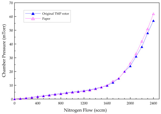 The processed turbomolecular pump rotor was tested according to the flow test standard in the industry, and the relationship between chamber pressure and flow was determined, as shown in Figure 13. Compared with the original TMP rotor, there are consistent characteristics in the variation of chamber pressure with the flow.