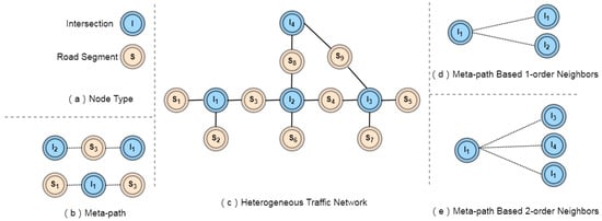 nth-order neighbors based on meta paths. For a node v in a heterogeneous traffic network, its nth-order neighbors are defined as the set of nodes connected to node i through meta path Φ with n-hop of the road network. Figure 1d,e respectively show the 1-order neighbor of I1, which is , and the 2-order neighbor of I1, which is . It should be noted that the nth-order neighbors of a meta path of a road network include that meta path.